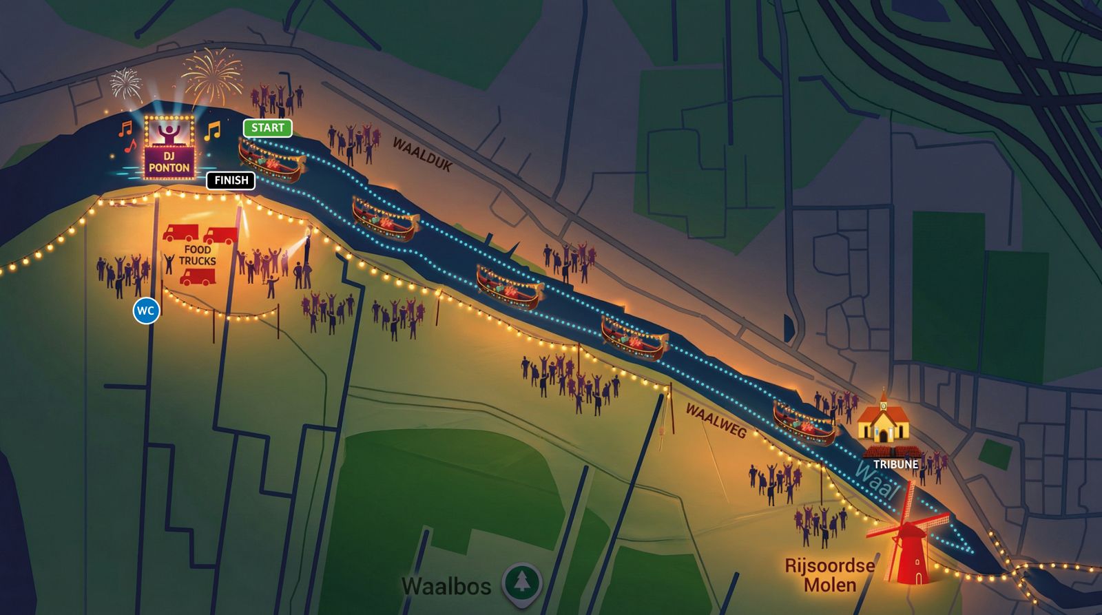 Het eindfeest vindt plaats op een unieke plek aan de Waal: de surfbocht. Deze locatie vormt het bruisende middelpunt van de avond, waar alles samenkomt.